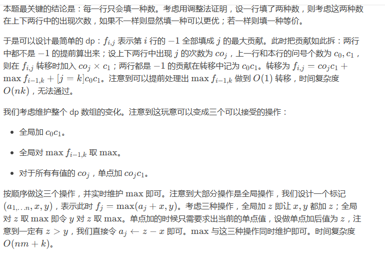 **部分分是 和 。 或 可以发现每个全 矩阵都填一样的数,算一下就好了。 就算 没发现每行所有数都相等也可以 表示第 行填了 个 ,可以建立凸包优化 dp。 就是正解的 dp,有提示 性吗? 反正时间复杂度 ,写的烂过不去的话,那就是你太菜了。其实带个 log 跑得飞快