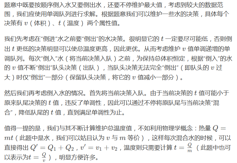 #include<bits/stdc++.h> using namespace std; const double eps=1e-8;//避免浮点误差 int n,l=1/*队首*/,r/*队尾*/; double V/*恒定总体积*/,q1[500010]/*单调队列中每个决策的体积*/,q2[500010]/*单调队列中每个决策的热量*/; double del/*每次倒出的水*/,a1/*倒入水的温度*/,a2/*倒入水的体积*/,sm1/*总体积*/,sm2/*总热量*/; int main() { scanf("%d%lf",&n,&V); for(int i=1;i<=n;i++) { scanf("%lf%lf",&a1,&a2); while(sm1+a2>V)//当前体积加上倒入水的体积大于恒定体积就倒出队头 { del=min(q1[l],sm1+a2-V);//倒出队头,倒不完就只倒一部分 sm1-=del;//减去队头体积 sm2-=del*q2[l];//减去队头热量 q1[l]-=del;//队头体积减去倒掉的部分 if(fabs(q1[l])<eps)//如果队头倒没了就出队 l++; } q2[++r]=a1; q1[r]=a2;//倒入水,入队 sm1+=a2;//更新体积 sm2+=a2*a1;//更新热量 while(l<r&&q2[r-1]>q2[r])//维护单调性 { r--; q2[r]=(q2[r]*q1[r]+q2[r+1]*q1[r+1])/(q1[r]+q1[r+1]);//混合后的队尾温度 q1[r]+=q1[r+1];//混合后的体积 } printf("%.7lf\n",sm2/sm1);//热量÷质量(体积)=温度 } return 0; }